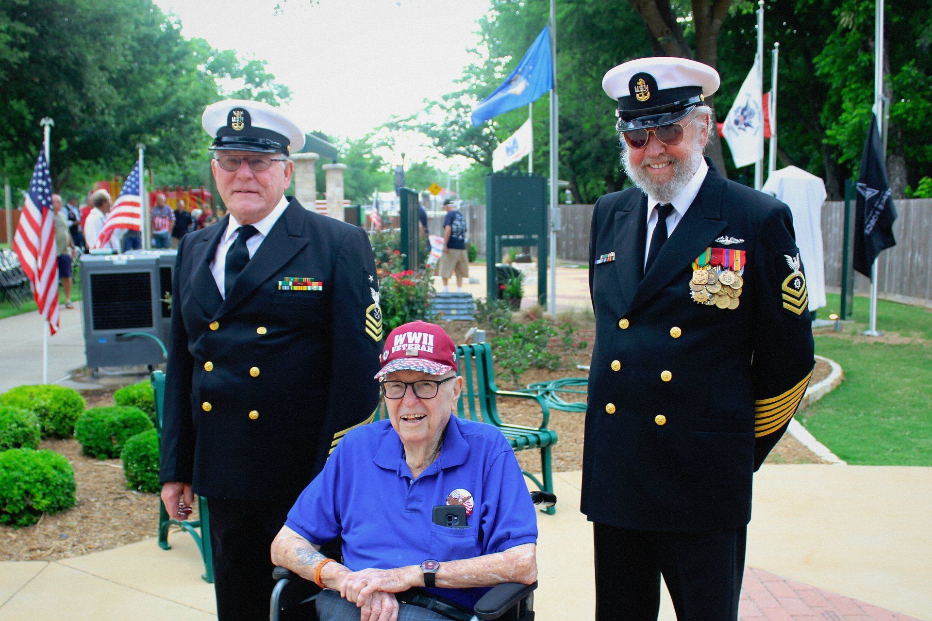 Master Chief Sheehan (ret) & Chief Goin (ret) with fellow Sailor, WWII Veteran Petty Officer 2nd Class Bill Bell at the Granbury Memorial Day Ceremony 2022