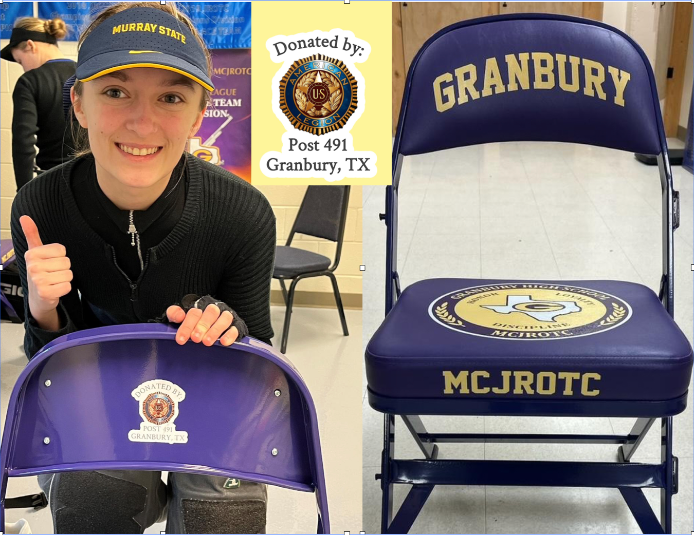 Granbury High School MCJROTC Cadet Caroline Martin with newly donated rifle range chairs - Mar 2023