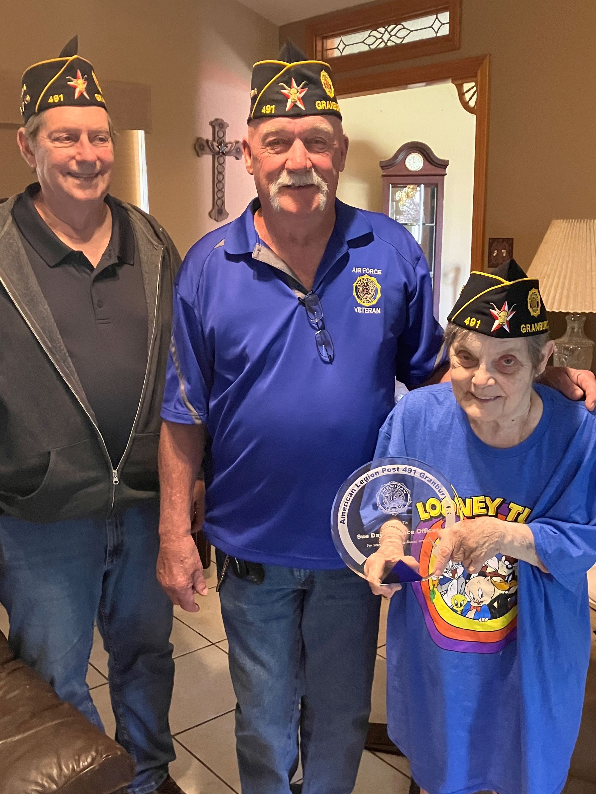 Post 491 Cdr Britt Hollingshead and Adj Ken Lobo presenting Appreciation Award to Mrs. Sue Day (Ret USAF MSgt, Vietnam War Era) for years of faithful service as Post 491 Finance Officer (Mar 13, 2023)